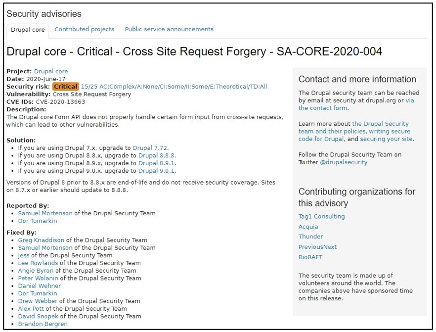 As part of our ongoing mission to help organizations develop and deploy more secure software and applications, and in light of Checkmarx’s expanded insight into the open-source security landscape with its recently launched SCA solution, the Checkmarx Security Research Team analyzed Drupal, an open-source content management system (CMS) and one of the top 10 most used PHP resources (frameworks, libraries, etc.) used by our customers. Over one million websites run on Drupal, including enterprise and government sites worldwide. Drupal just recently released two major versions, which piqued our researchers’ interest. Once the team got to work on the two latest versions of Drupal, they quickly found that both versions were vulnerable to being exploited. Later, it is was confirmed by Drupal that every maintained version of Drupal (7.x, 8.8.x, 8.9.x) were easily exploitable by the same techniques. These issues were discovered by Dor Tumarkin of the Checkmarx Security Research Team. Drupal acknowledged and patched the vulnerability, assigning it CVE-2020-13663. More information can be found below and on their security advisories page. What is the Issue? The Checkmarx Security Research Team identified a document object model-based cross-site scripting (DOM XSS for short) vulnerability in Drupal Core. This type of XSS attack is achievable if a web application enters data to the DOM without being appropriately sanitized. In this case, an attacker can manipulate their input data to include XSS content on the web page, for example, malicious JavaScript code, which in-turn would be consumed by Drupal Core itself. What is the Risk? An attacker abusing this vulnerability can take over the administrator role of a Drupal-based website and get full control that allows changing of content, creating malicious links, stealing sensitive or financial data, or whatever else comes to mind. Drupal Assigns CVE-2020-13663 Drupal labeled the Security Risk of this vulnerability our team discovered as follows: Risk: Critical Access Complexity: Complex Authentication: All/Anonymous Users Confidentiality Impact: Certain Non-Public Data is Released Integrity Impact: Some Data Can be Modified Exploit (Zero-day Impact): Theoretical or White-hat (no public exploit code or documentation on development exists) Target Distribution: All Module Configurations are Exploitable Summary of Disclosure and Events When the vulnerability was first discovered, the Checkmarx Security Research Team responsibly notified Drupal of its findings. Our team was asked to advise Drupal’s team after our disclosure, which we willingly did. After we disclosed the vulnerability, the Drupal team’s sense of urgency and professionalism was quite notable, and a fix was made available within a week of our disclosure. In accordance with Drupal’s disclosure guidelines and to give its users adequate time to update their software, Checkmarx will refrain from publishing a more technical report showing an in-depth walkthrough and proof-of-concept of exploiting this vulnerability for 60 days. In the meantime, we strongly encourage Drupal users to take action on recommended updates. Recommendation At this time, Checkmarx highly recommends that anyone using Drupal update the version in use immediately to the latest release, which contains a fix for this vulnerability. Checkmarx customers using Checkmarx Software Composition Analysis (CxSCA) have already been automatically notified to update Drupal while running a scan of their code base. Final Words This type of research activity is part of the Checkmarx Security Research Team’s ongoing efforts to drive the necessary changes in software security practices among all organizations in an effort to improve security for everyone. Checkmarx is committed to analyzing the most prominent open-source packages to help development teams ship more secure software and improve their software security risk posture. Our database of open source libraries and vulnerabilities is cultivated by the Checkmarx Security Research Team, empowering CxSCA with risk details, remediation guidance, and exclusive vulnerabilities that go beyond the NVD. For more information or to speak to an expert about how to detect, prioritize, and remediate open-source risks in your code, contact us. Tags: Application Security Vulnerabilities Checkmarx Security Research Team Drupal security analysis Open-Source Projects Open-Source Software SCA Software Composition Analysis