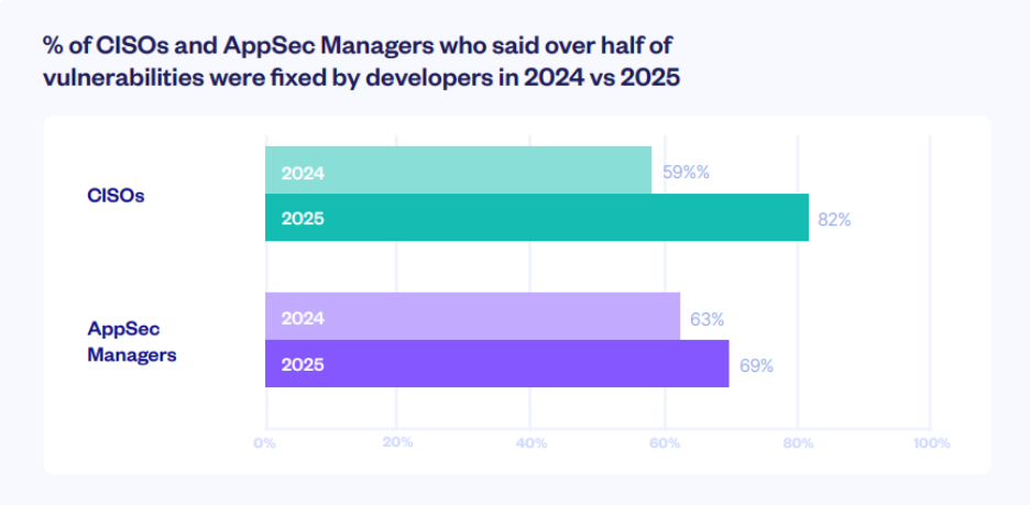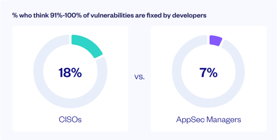 While 82% of CISOs say developers fix most vulnerabilities (and 18% believe nearly all are resolved), Only 69% of AppSec managers agree, and just 7% think fix rates are anywhere near 100%.