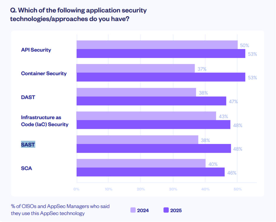 One of the issues that drew attention from the panel members was the across-the-board underutilization of AppSec tools. As clearly shown in the Future of AppSec in the Era of AI report, despite the rising level of risk, adoption of even the most essential tools — SAST, DAST, API, and container security — hovers around 50% at best, and there’s no indication of any significant year-over-year improvement.